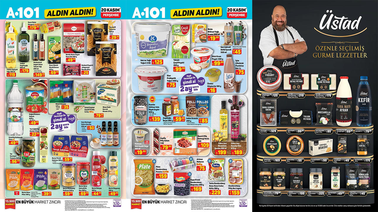 Soğuk sıkım tohum yağı, zeytinyağı, ayçiçek yağı, üçgen mantı dana etli, makarna, karbonatlı sirke, domates salçası, gevrek ekmek, kahve şurubu, tavuk salatası, hazır pilav, közlenmiş patlıcan ve ketçap gibi ürünlerin yer aldığı 20 Kasım tarihinden itibaren geçerli olacak A101 kataloğu yayınlandı.