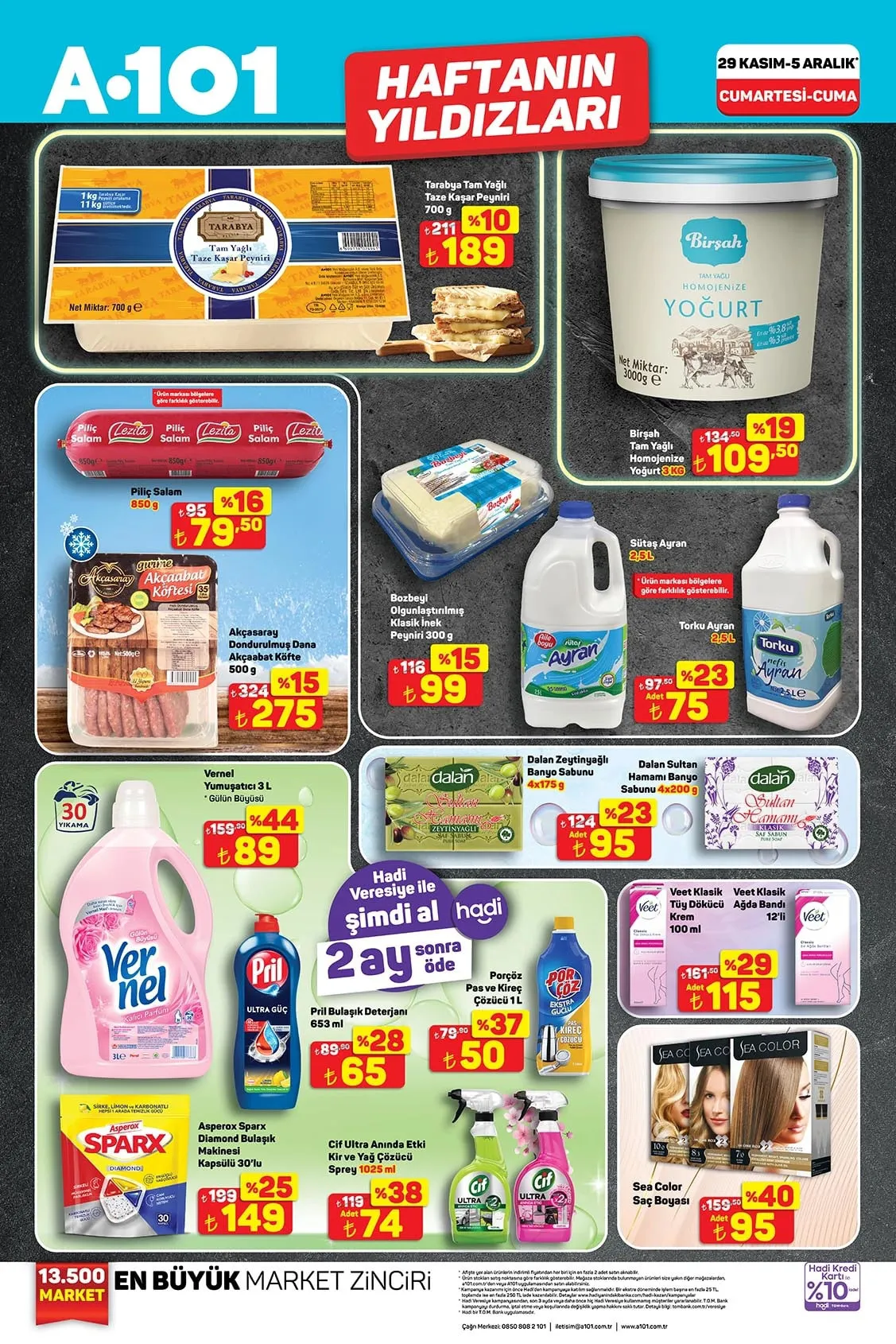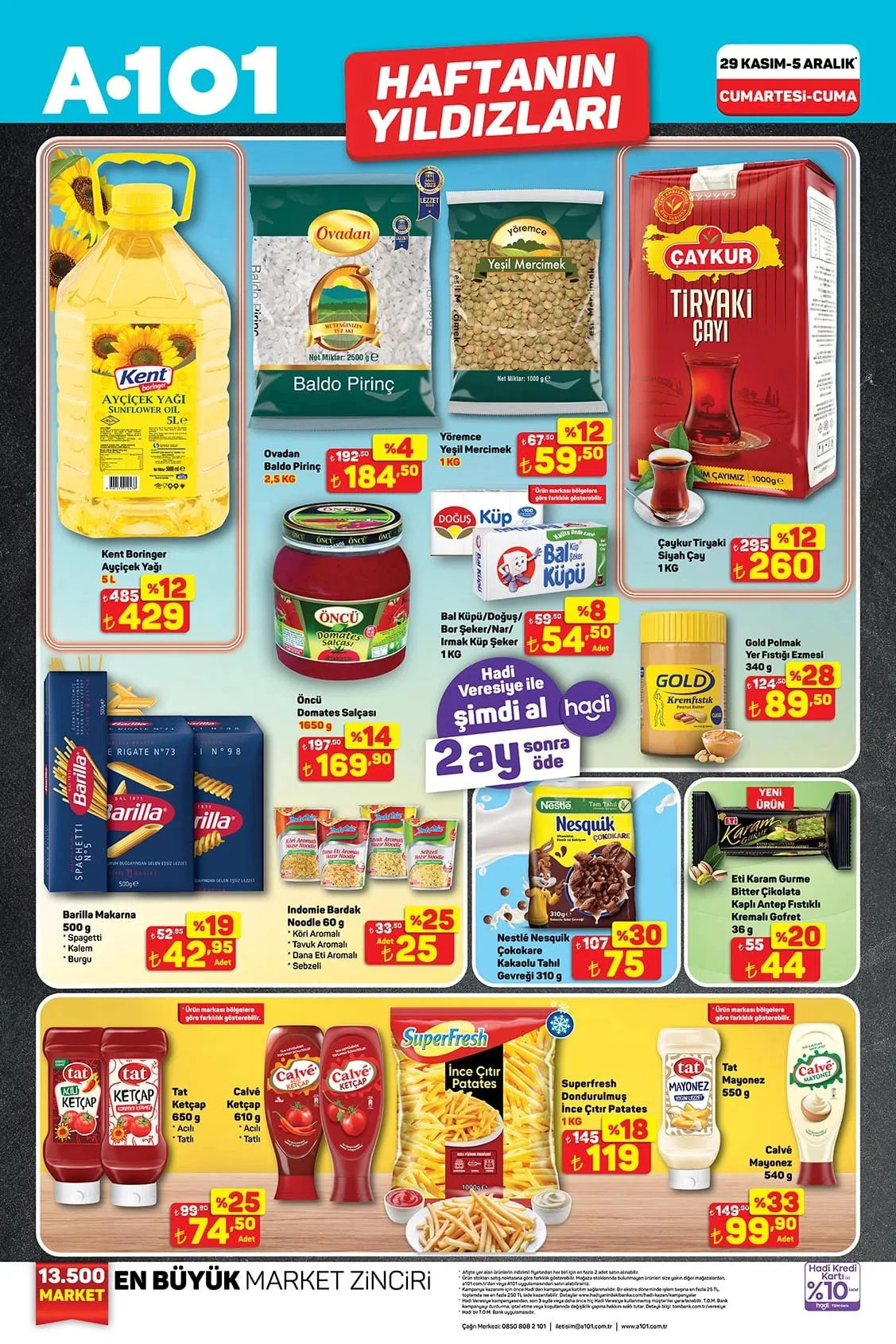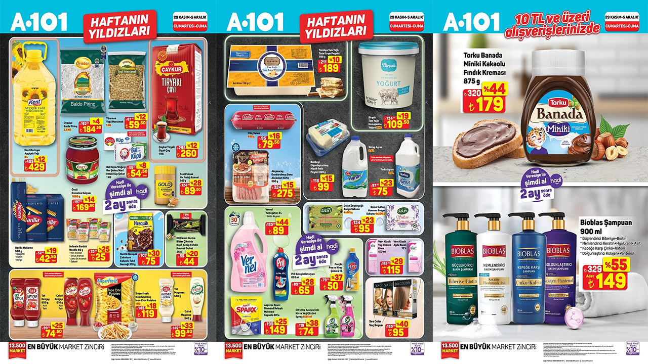 Ayçiçek yağı, baldo pirinç, yeşil mercimek, siyah çay, küp şeker, domates salçası, makarna, ketçap, dondurulmuş ince çıtır patates, mayonez ve kaşar peyniri gibi ürünlerin yer aldığı 29 Kasım tarihinden itibaren geçerli olan A101 kataloğu yayınlandı.