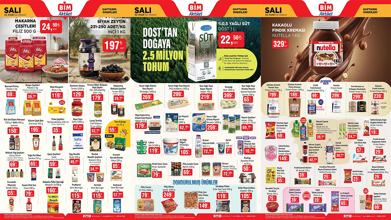 Makarna, siyah zeytin, bulgur çeşitleri, margarin, domates salçası, yeşil zeytin, haşlanmış bakliyat çeşitleri, sirke, süzme çiçek balı, yağlı pul biber, çeşni çeşitleri, noodle, gevrek ekmek, karbonat, profiterol ve piliç döner gibi ürünlerin yer aldığı 2 Aralık tarihinden itibaren geçerli olacak BİM kataloğu yayınlandı.