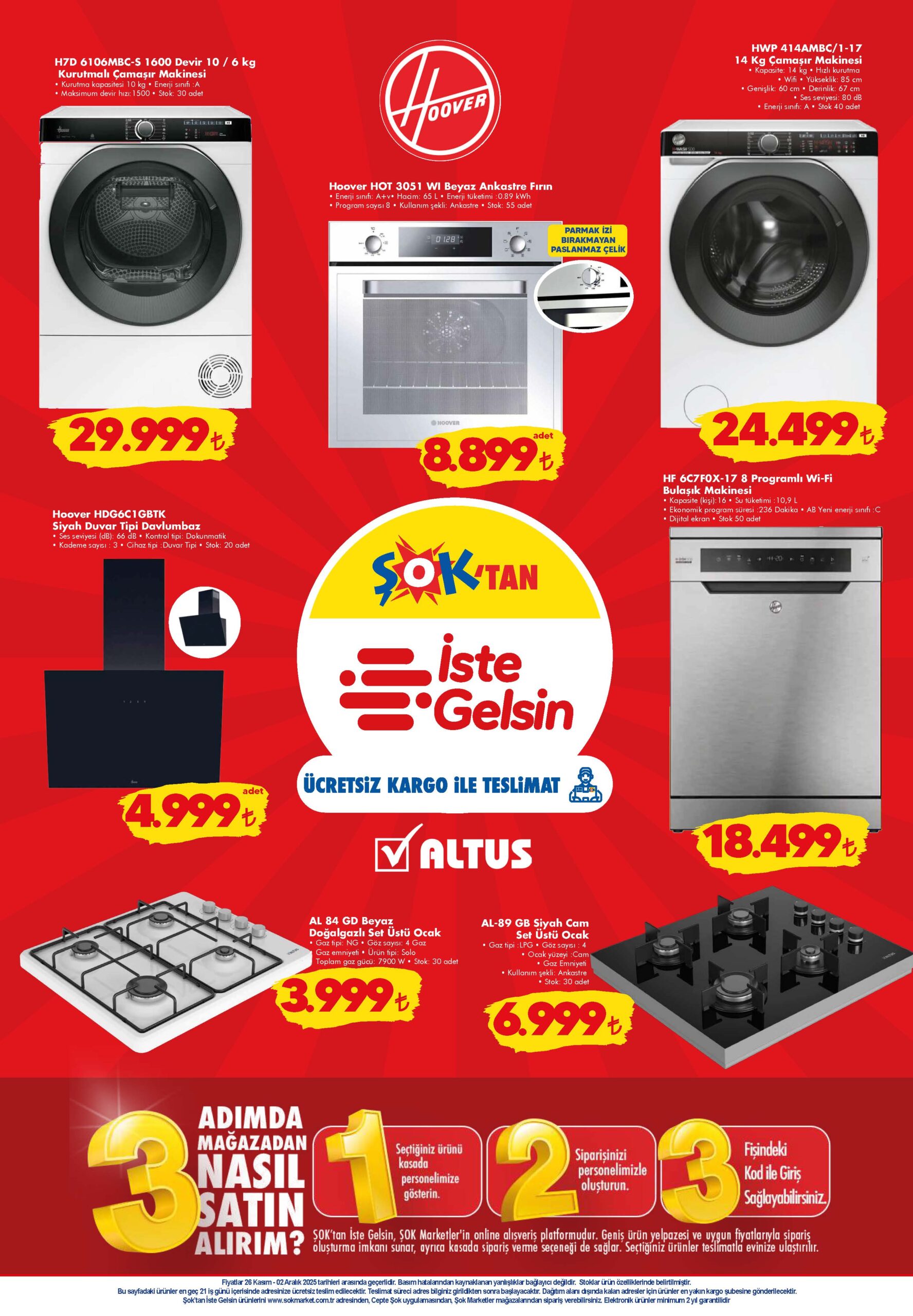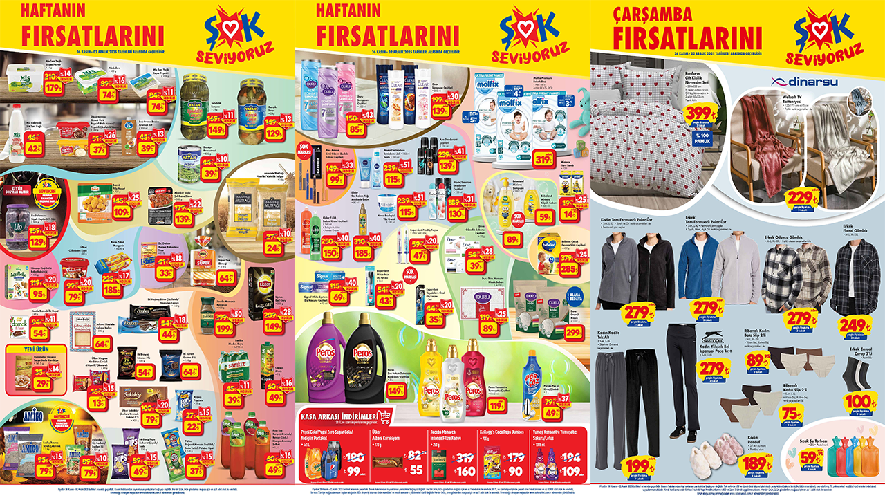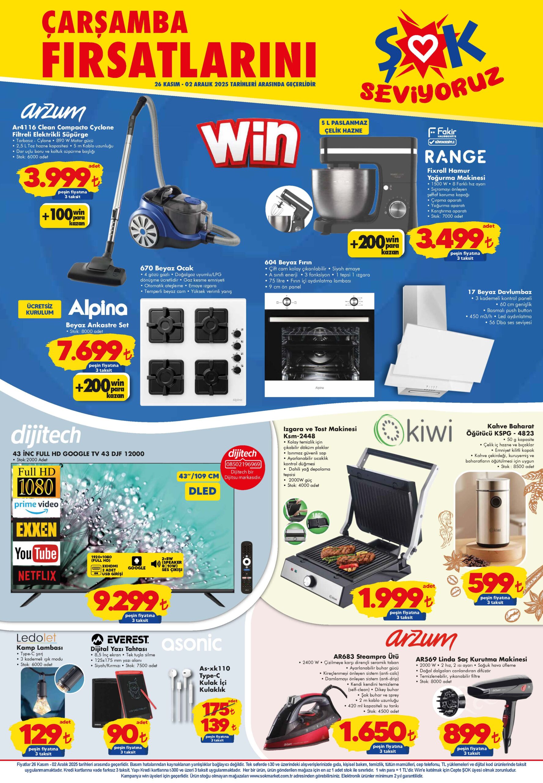 Televizyon, ızgara ve tost makinesi, kamp lambası, dijital yazı tahtası, ütü, saç kurutma makinesi, kurutmalık, ütü masası, süzgeç, sabunluk seti, temizlik seti ve toz alma aparatı gibi ürünlerin yer aldığı 26 Kasım tarihinden itibaren geçerli olacak ŞOK kataloğu yayınlandı.